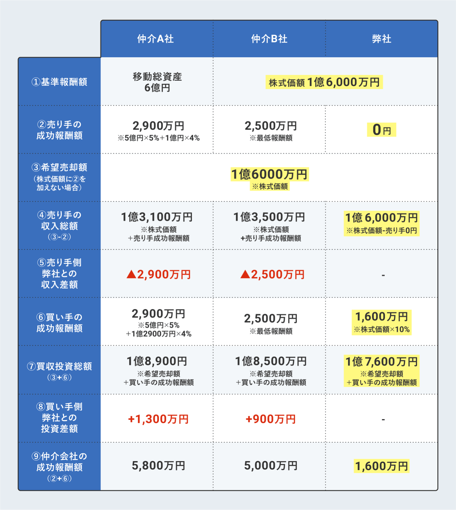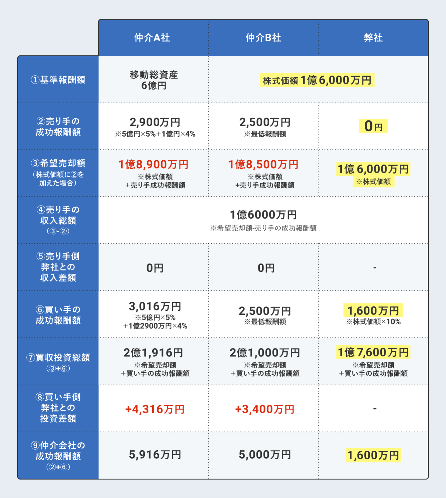 希望売却価額に売り手の成功報酬額を含められている場合、株価レーマン方式のB社と比べても、最低報酬額やBuyサイドのみから頂くスタイルの違いから、弊社の料金体系がBuyサイドの買収投資総額(⑧)は最も抑えることにつながります。