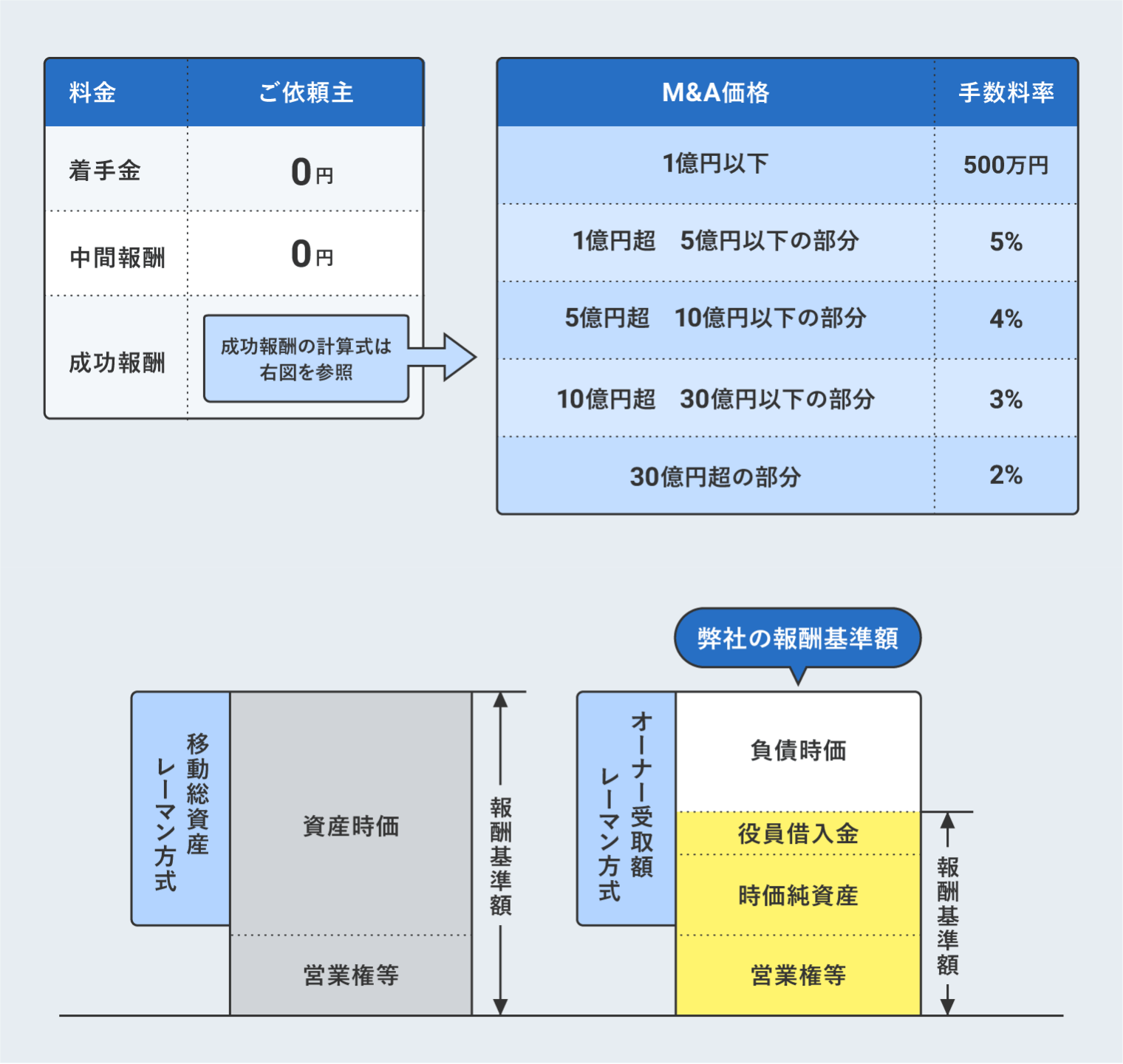 成功報酬額は「基準報酬額を何の金額とするか」で大きく変わります。手数料率を掛け合わせる弊社の報酬基準額は、”移動総資産レーマン方式“ではありません。実際に譲渡される会社や事業のM&A価格(時価純資産+営業権等)に役員借入金を加算した“オーナー受取額レーマン方式“を採用しています。