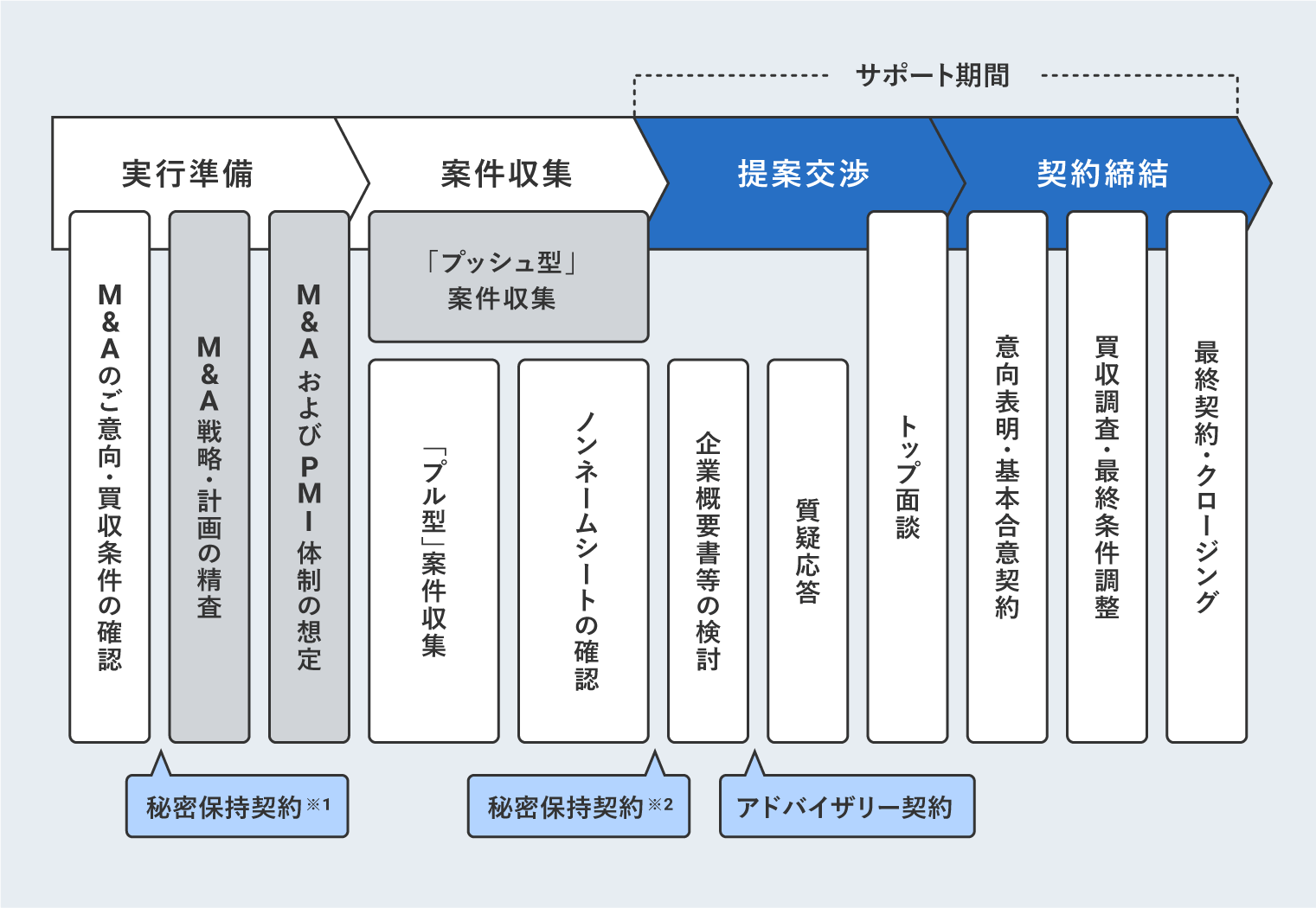 弊社が「M&A仲介」、あるいは「FA(専属アドバイザー)」として介在する場合、秘密保持契約(NDA)を締結の上、企業概要書ベースで対象案件のご提案を行います。