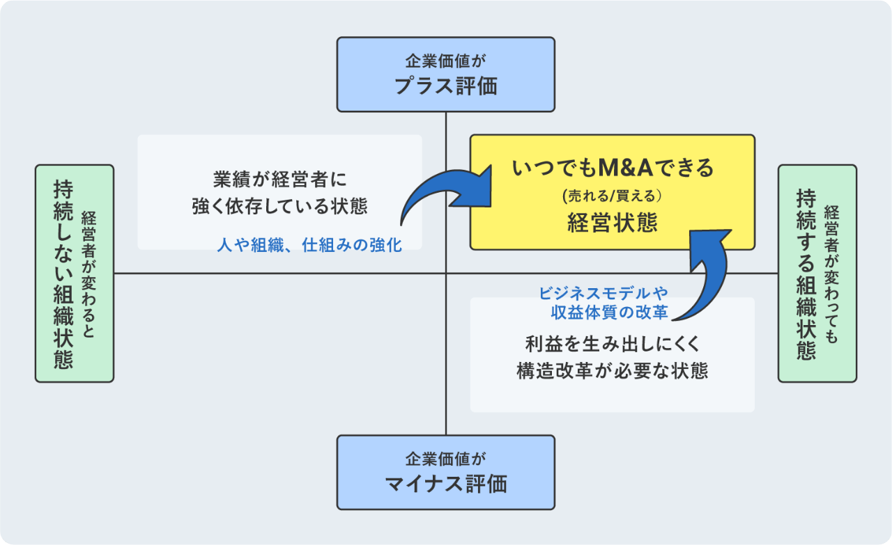 具体的には、買い手側は当然のことながらリターンを見込んで投資しますので、売り手側は企業価値がある(利益が出ている)状態をつくりつつ、経営者が交代しても事業を持続できる組織をつくりあげることが重要になります。