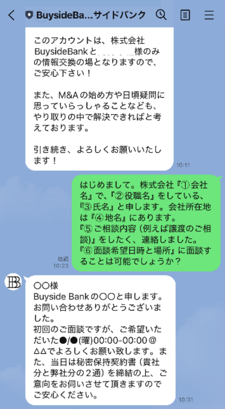 友だち追加メッセージが届いたら、左記の例文を参考に、以下の6つの要素を入力し、送信をお願いいたします。