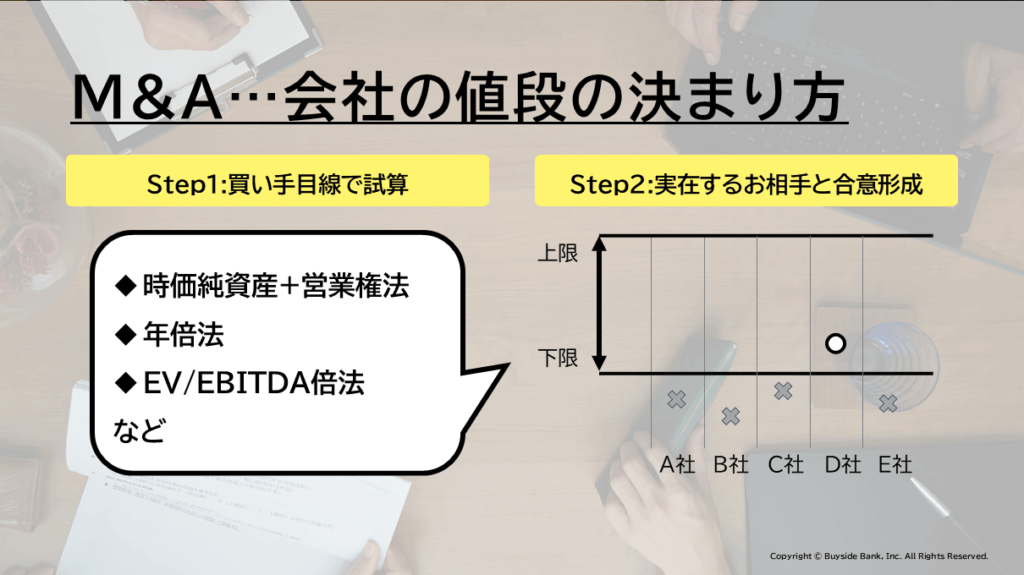 そうやって出した試算額をベースに考えつつ、M&Aを提案するプロセスで、実在するBuyサイドと交渉していく中で譲渡価額が合意形成されていきます。