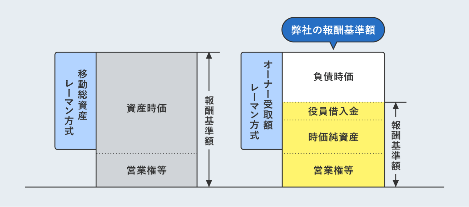 手数料率を掛け合わせる弊社の報酬基準額は、”移動総資産レーマン方式“ではありません。実際に譲渡される会社や事業のM&A価格(時価純資産+営業権等)に役員借入金を加算した“オーナー受取額レーマン方式“を採用しています。