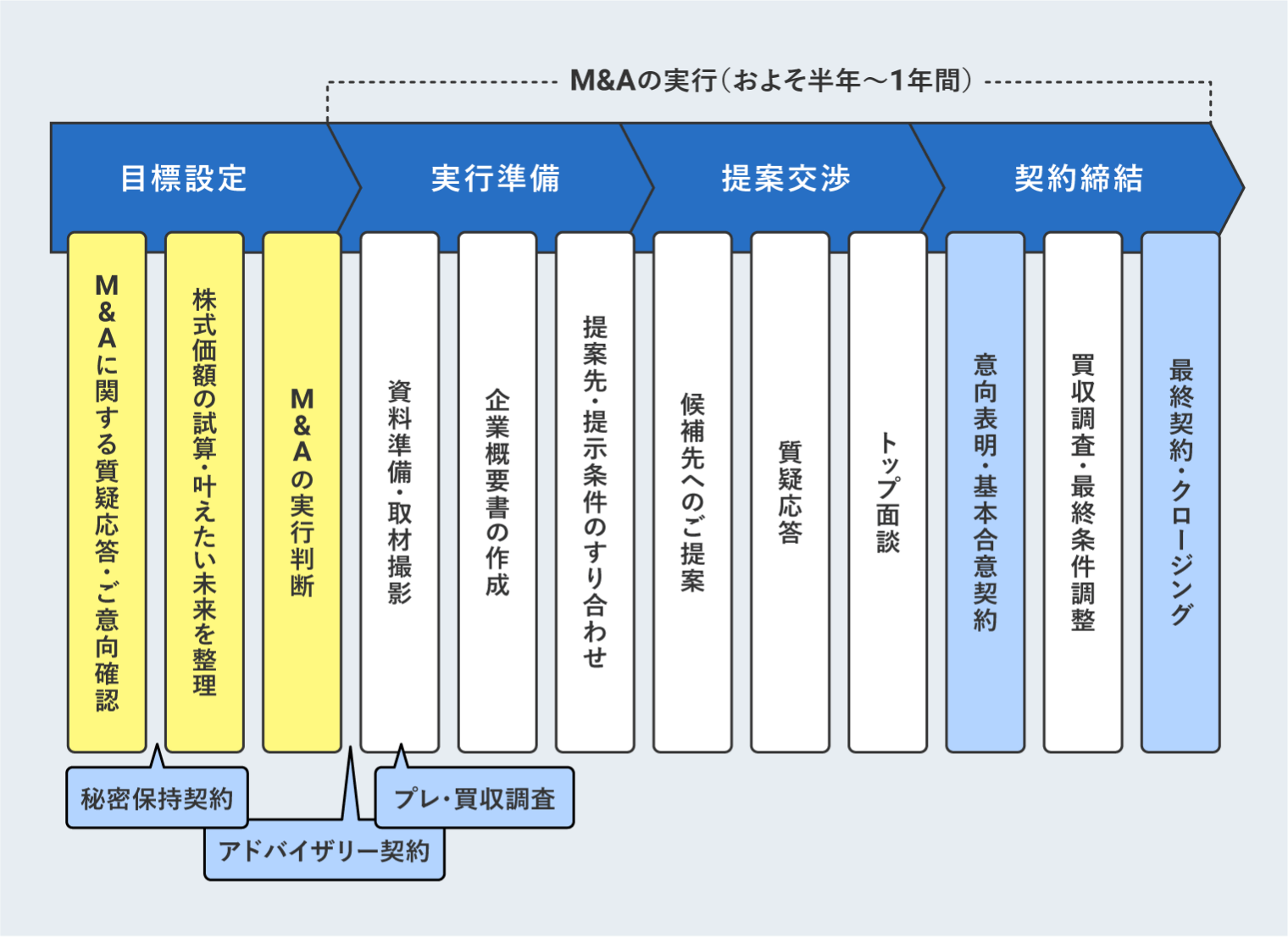 会社や事業の売却が、本当にベストな選択なのか。そのようにM&Aを実行すべきか判断に迷っている方も、まずは気軽にお問い合わせください。おひとりお一人のご意向をお伺いし、株式価額の試算や叶えたい未来の整理など、後悔のない意思決定ができるようにサポートさせていただきます。そして、M&Aの実行を決断し、弊社とアドバイザリー契約を締結することになれば、売り手と買い手の双方が納得のいくM&Aを実現できるようにプロセスを丁寧に進めていきます。