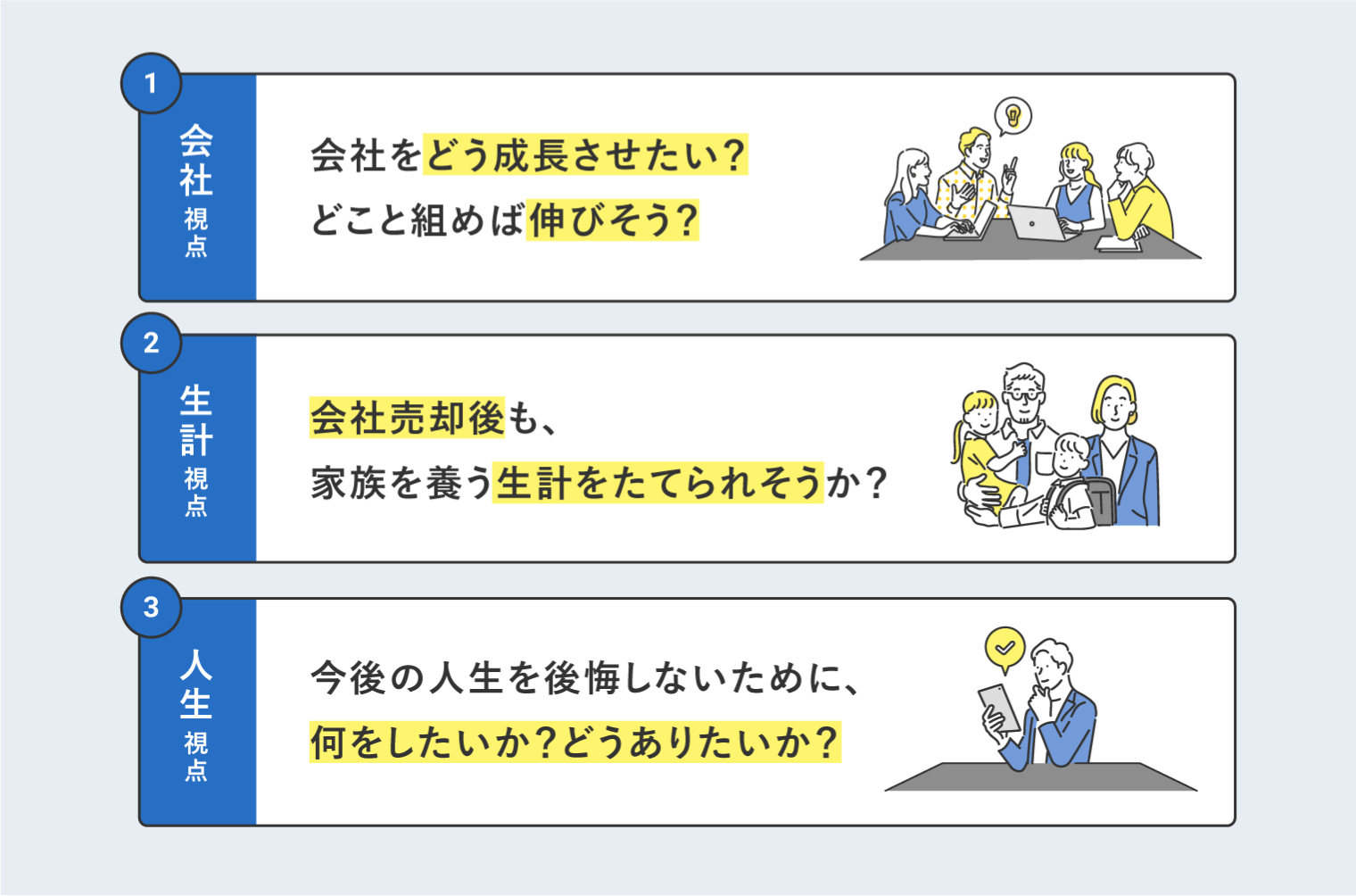 「本当に今、会社を売却することがベストな選択なのか?」 私たちは、その根本的な問いから、ご一緒させていただきます。会社の将来はもちろん、ご家族の暮らし、そして社長ご自身のこれからのやりがい。あらゆる視点から考え抜き、後悔のない意思決定ができるよう、誠実にサポートいたします。