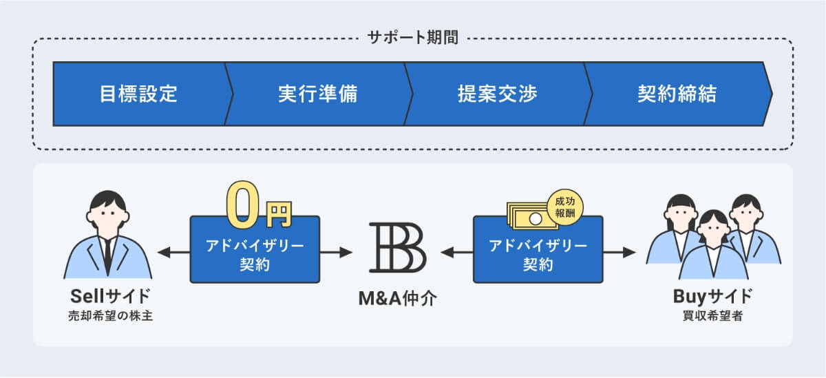 なお、弊社の特徴のひとつは、M&A仲介手数料に関する独自の料金体系です。M&A仲介として進める場合、サービスの対価としていただくのはBuyサイドからの成功報酬のみとしており、Sellサイドは成功報酬も0円となります。そのため、弊社に会社や事業の売却をご依頼いただいた場合、ほとんどはM&A仲介のカタチで進めていくことになります。